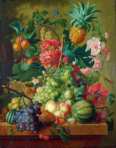 鳳梨、葡萄和鸚鵡組成的插花 |