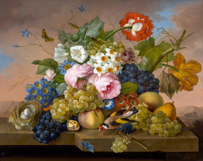 鳳梨、葡萄和鸚鵡組成的插花 |